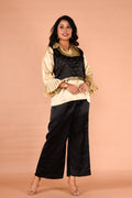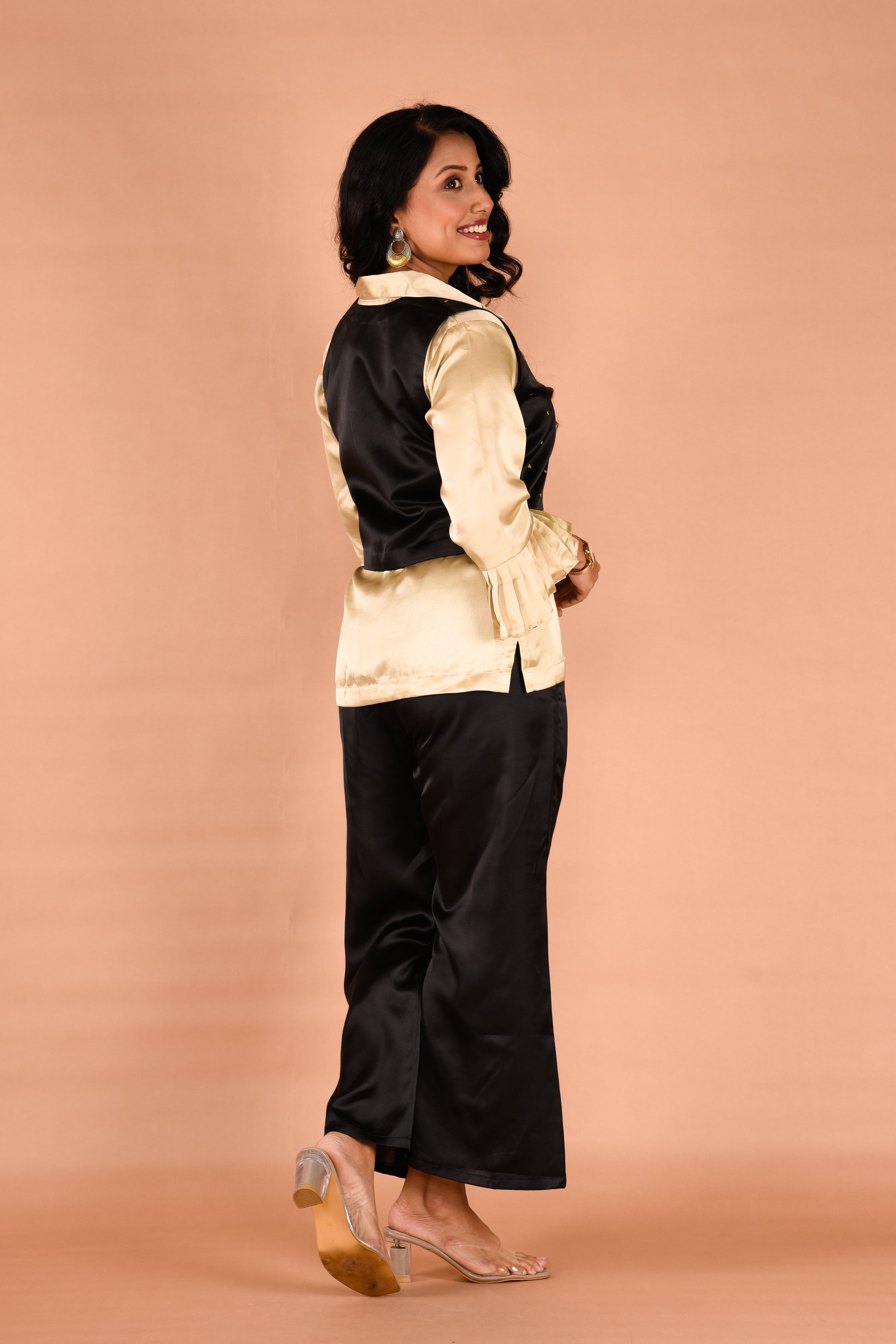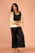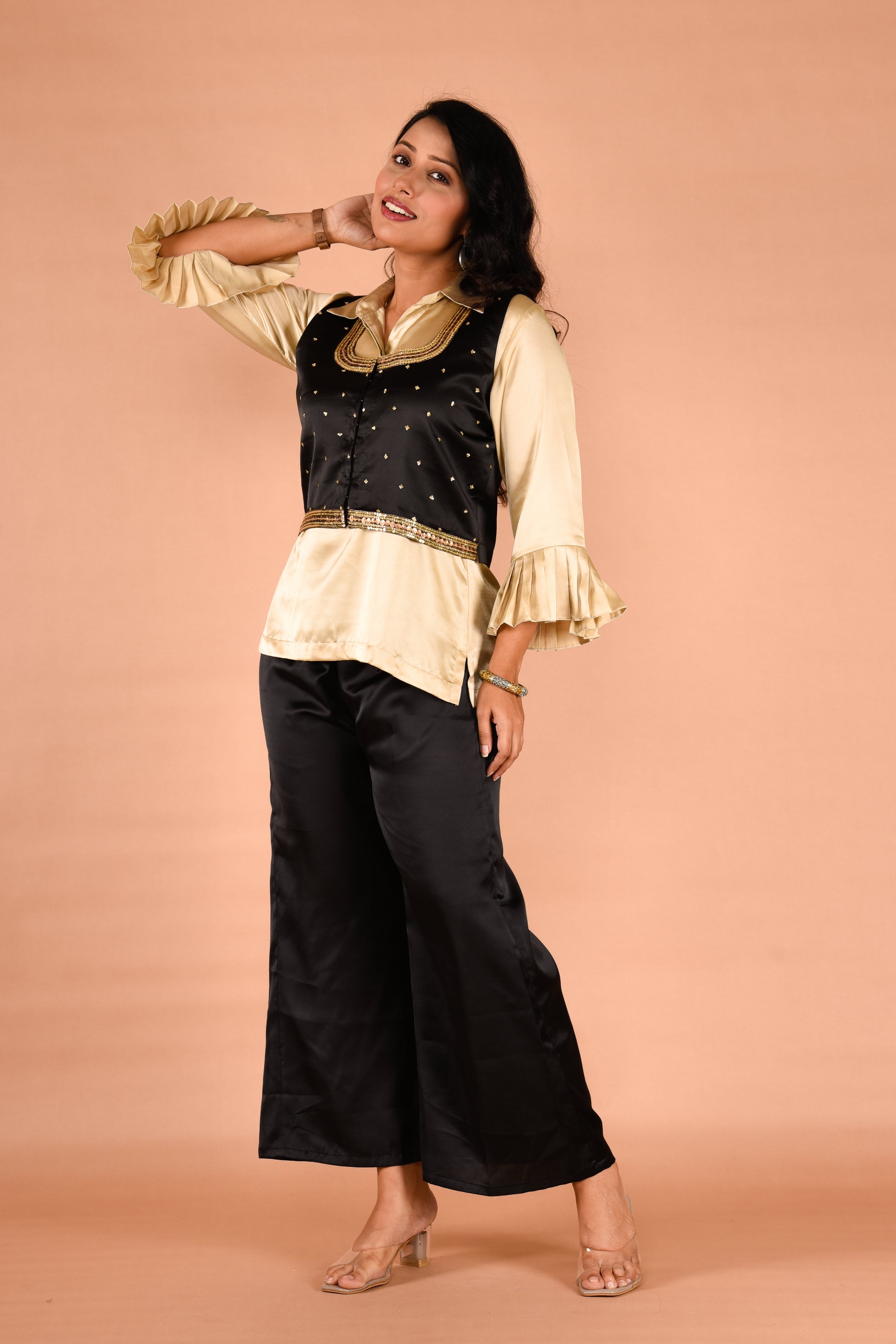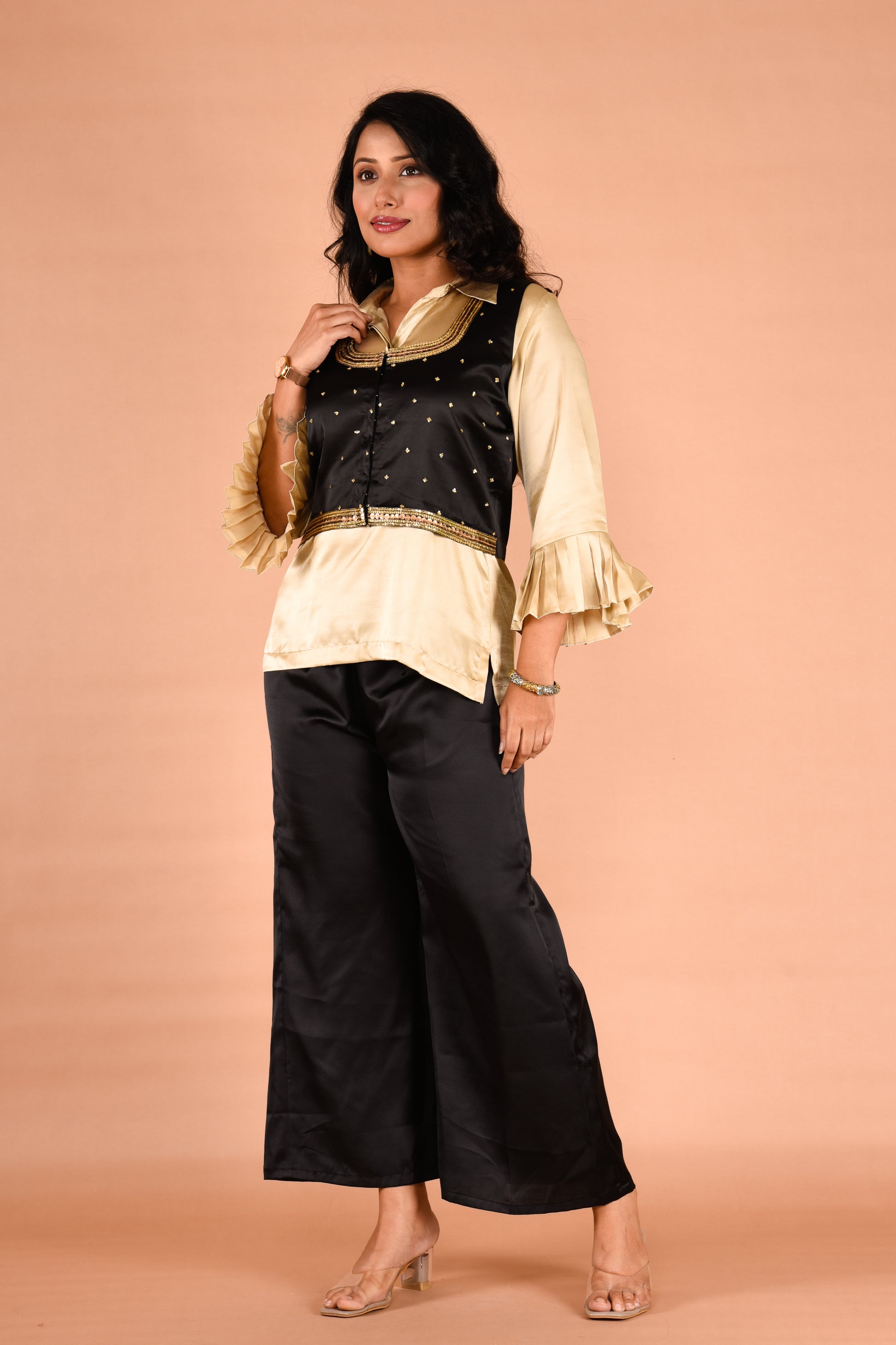 Shirt styled fawn colored tunic teamed with black sequence hand embroidered jacket and a black trouser