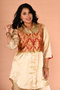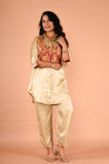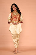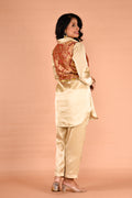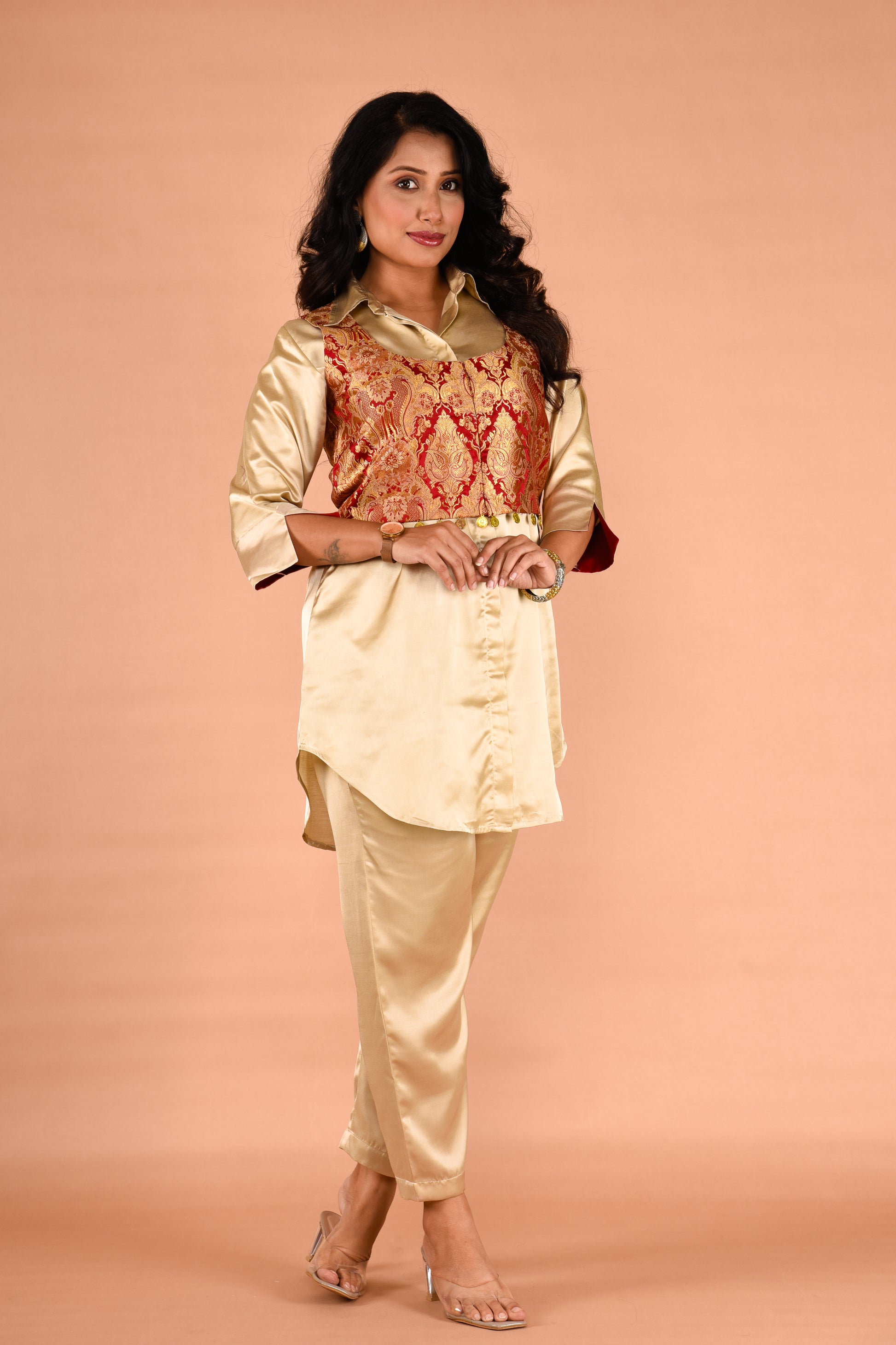Shirt styled tunic with matching trouser, teamed up brocade jacket paired featuring metal coin details on the waist