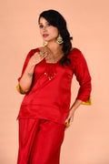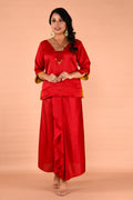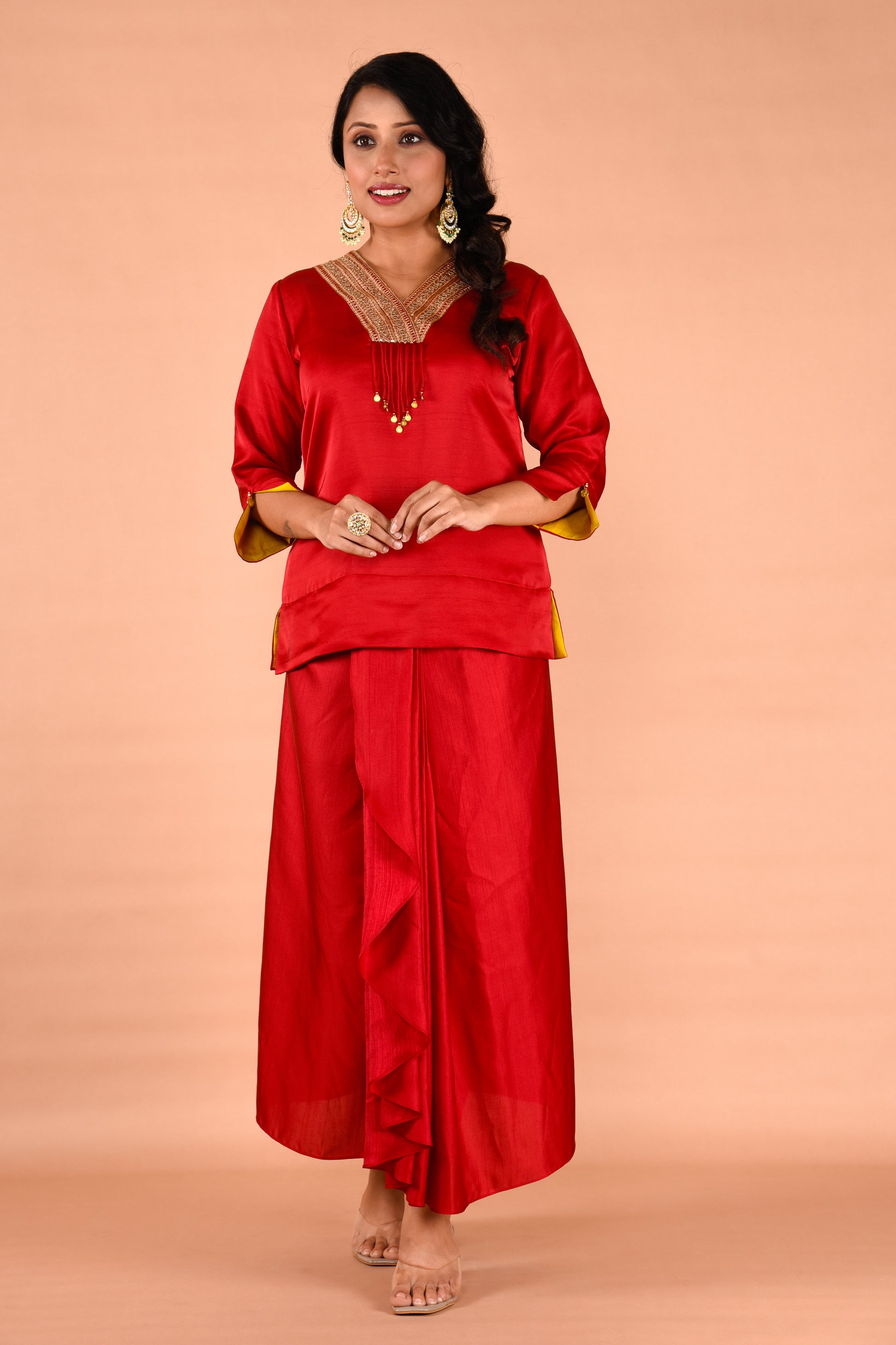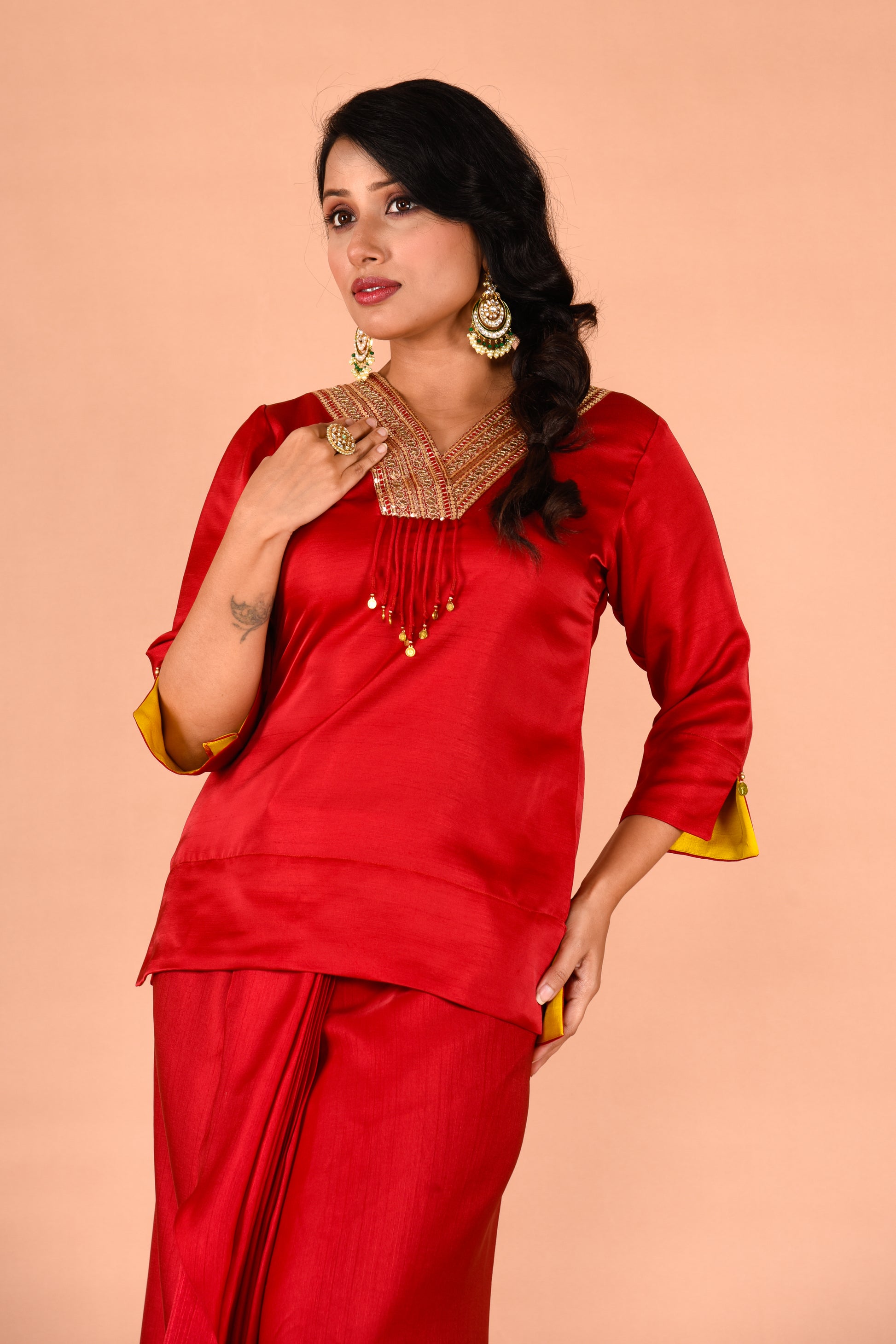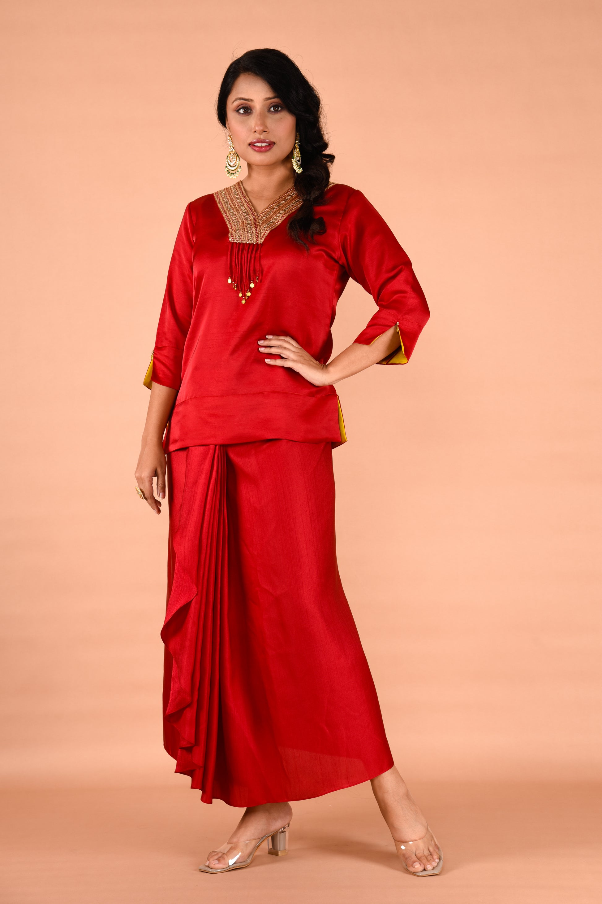 Sequence Hand embroidered top detailed with tassels and paired with a stylish front pleated skirt.